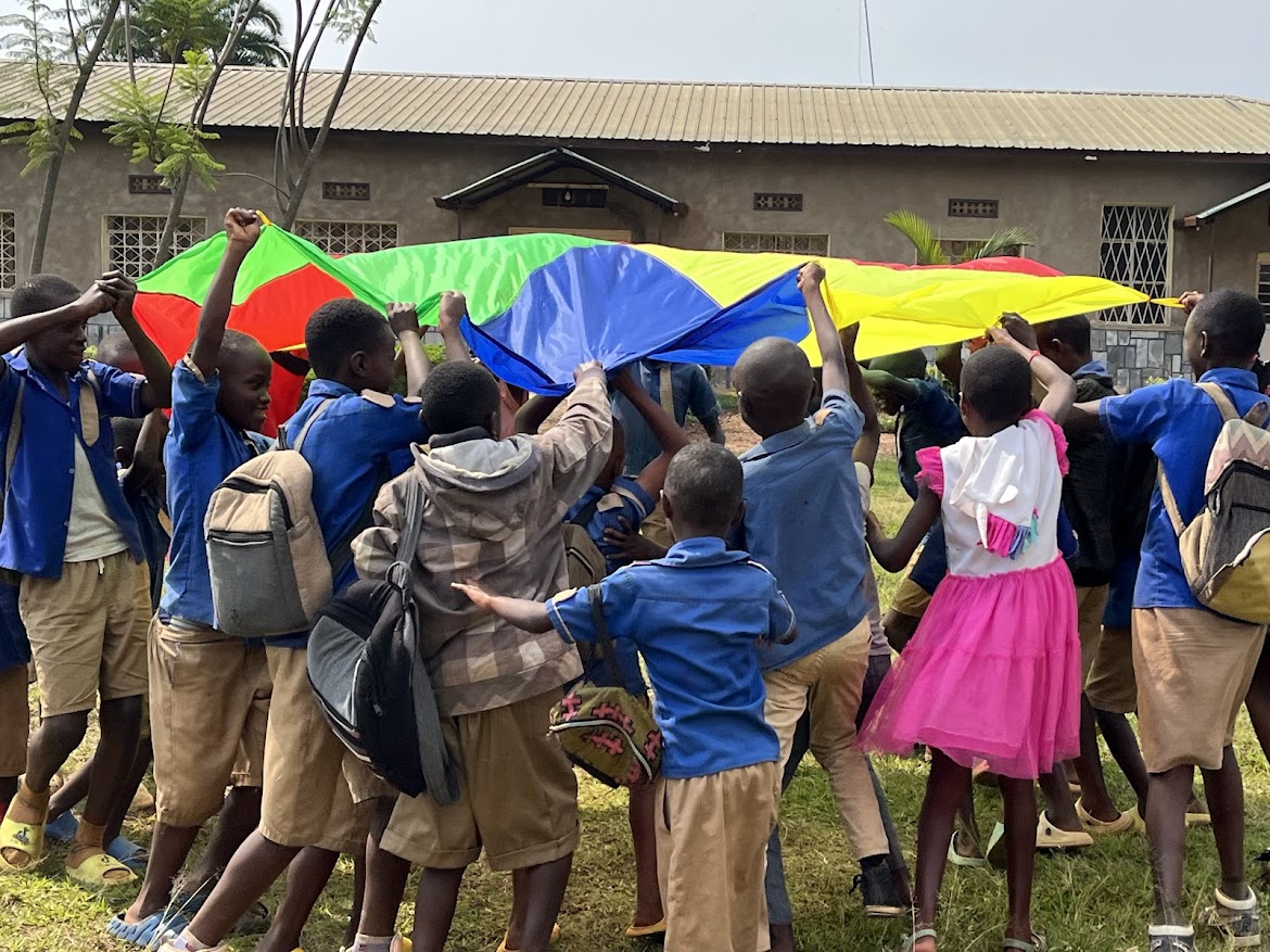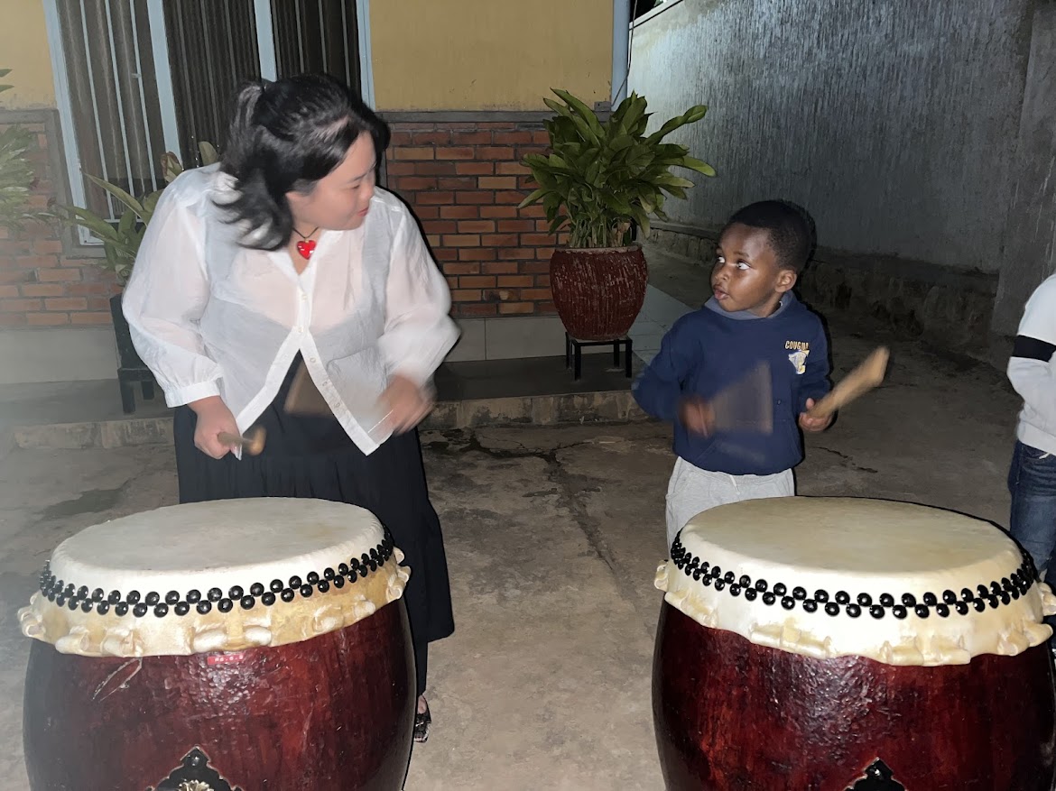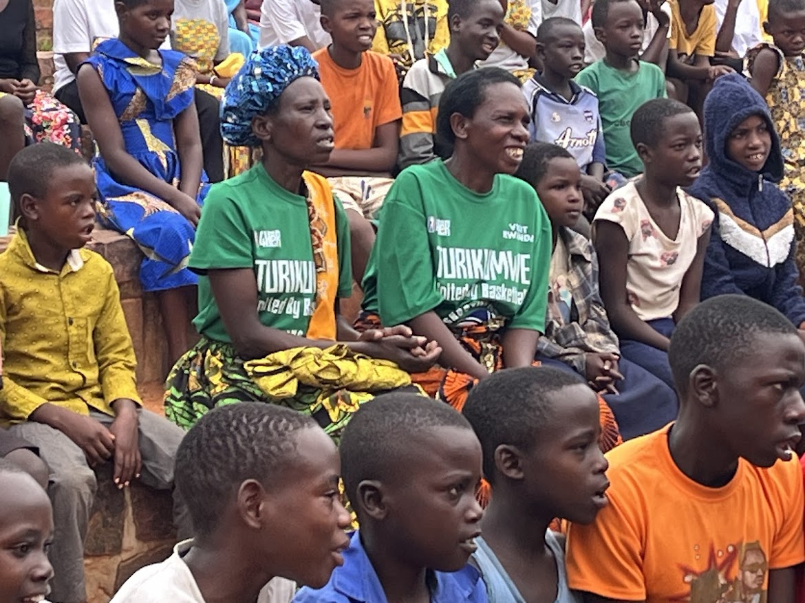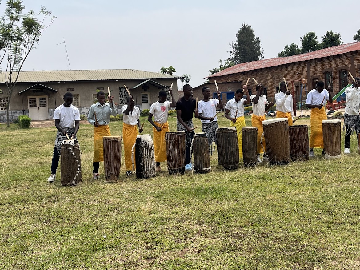 円形劇場のような中庭に超満員の観客が待ち構え、地元のお母さんたちのダンスと太鼓で幕開け。RfRは子どもたちの読み書きを支援するNGOで、音楽やダンス、ICTクラスを通じて地域の誇りを育んでいます。和太鼓チームの女性2人の力強い演奏は、伝統的に男性が担うルワンダの太鼓文化に新風を吹き込み、拍手喝采! 女性のエンパワメントを体現した瞬間でした。昼過ぎに公演を終え、20分離れた次の会場「Akagera Good Neighbor(AGN)」へ。